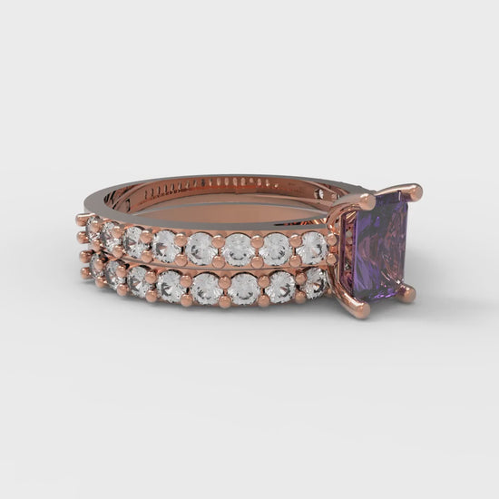 1.325 cttw Emerald Cut Natural Amethyst Bridal Set - Solid Rose Gold Engagement Ring & Wedding Band