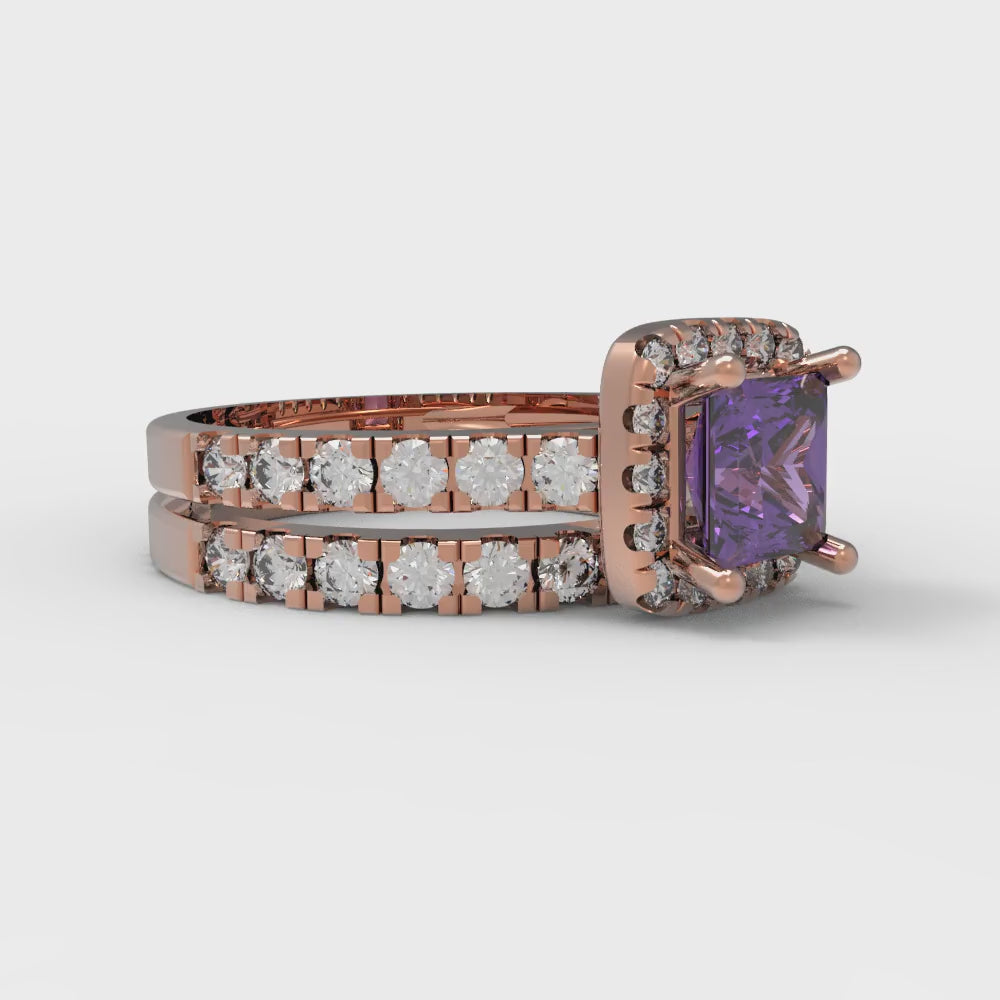 1.56 cttw Princess Cut Natural Amethyst Bridal Set - Solid Rose Gold Engagement Ring & Wedding Band