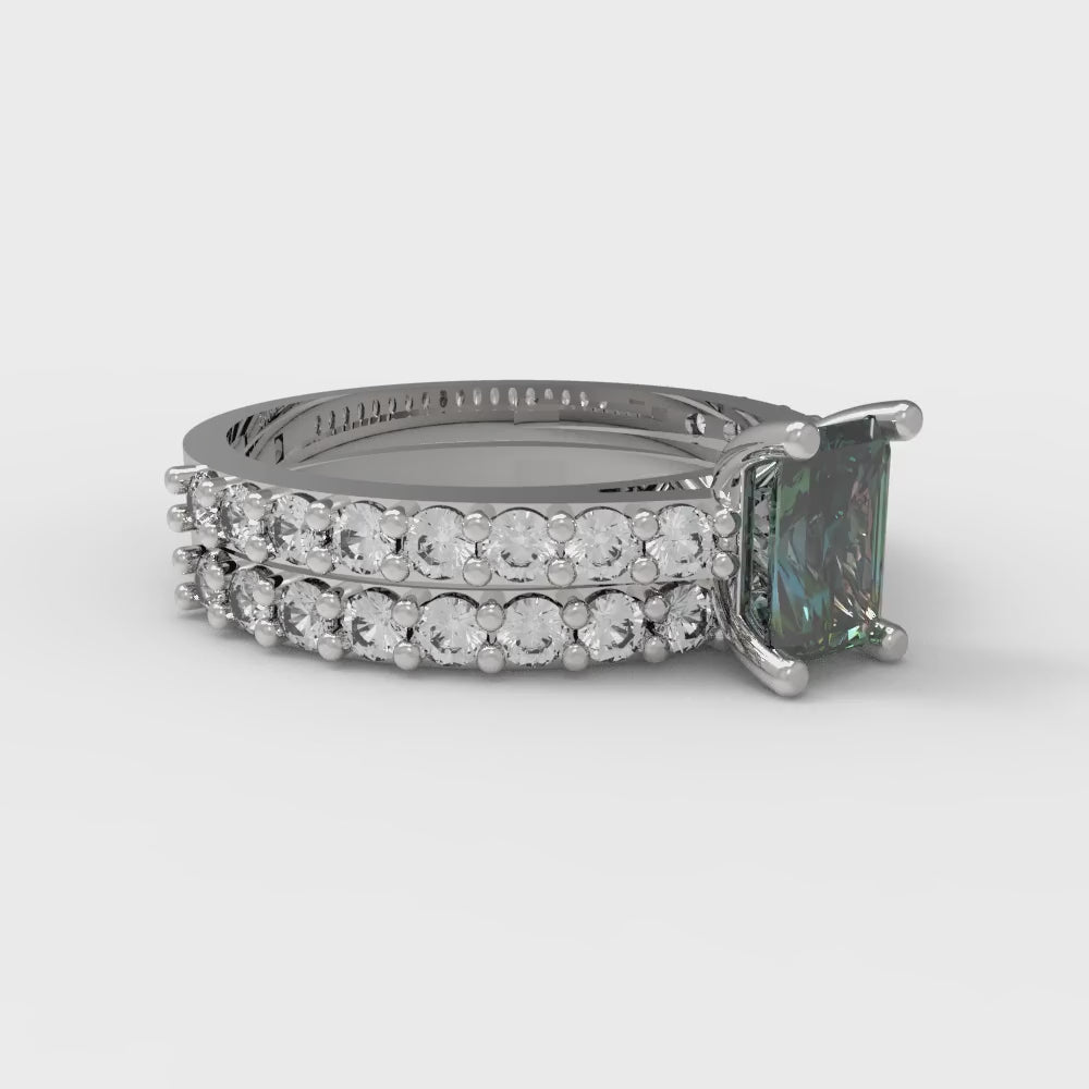 1.325 cttw Emerald Cut Blue Moissanite Bridal Set - Solid White Gold Engagement Ring & Wedding Band