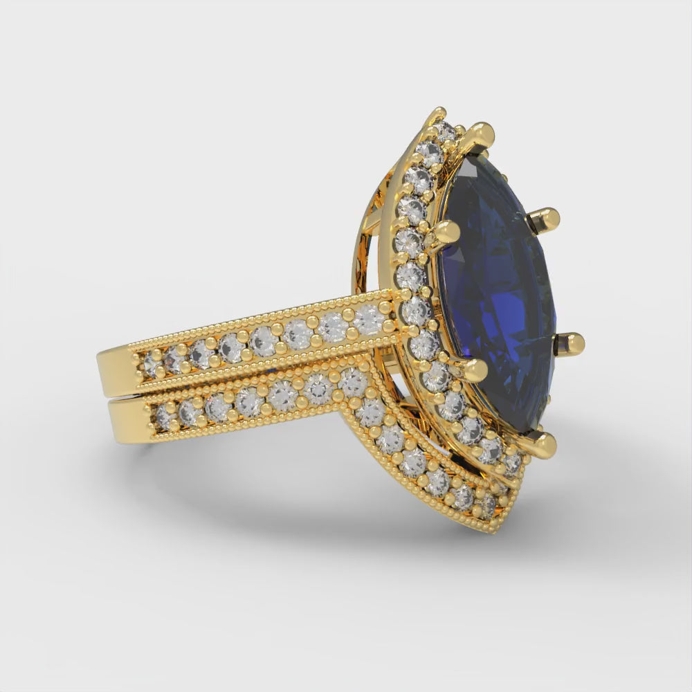 2.4875 cttw Marquise Cut Simulated Blue Sapphire Bridal Set - Solid Yellow Gold Engagement Ring & Wedding Band