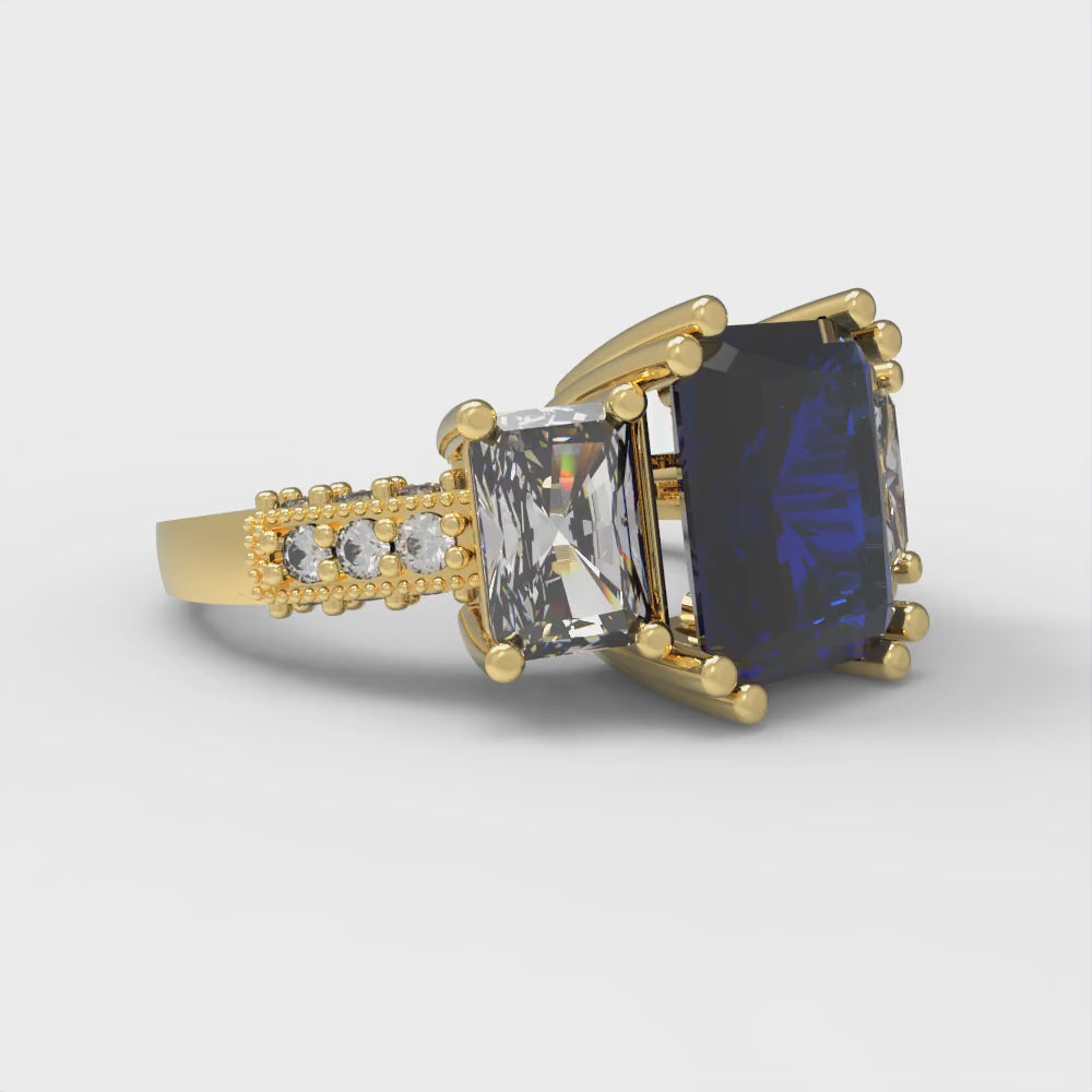 4.27 cttw Simulated Blue Sapphire Three-Stone Engagement Ring - Solid Gold (Emerald Cut,9x7mm)