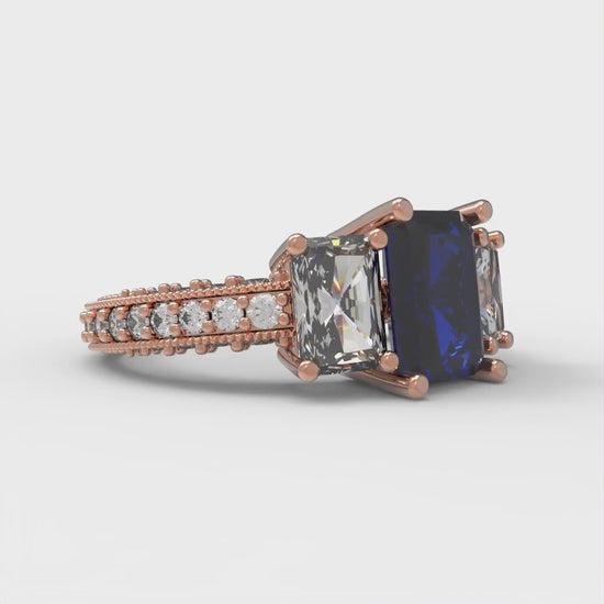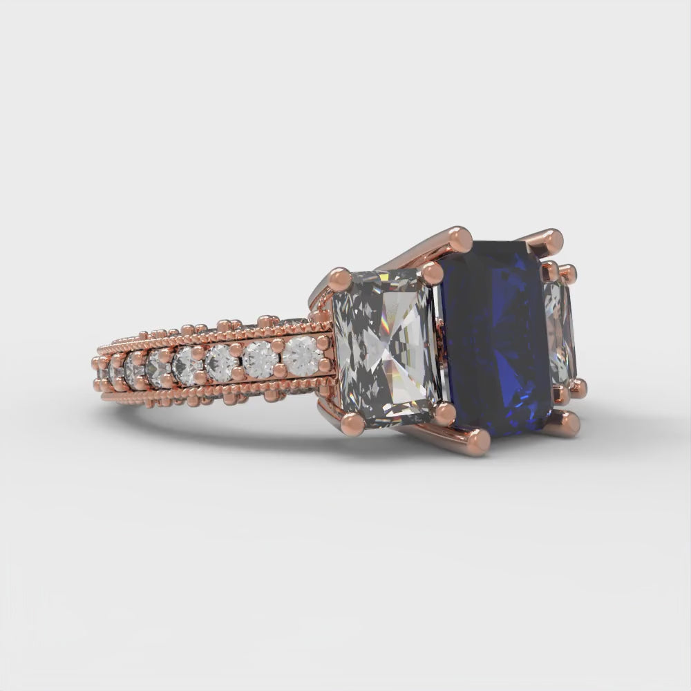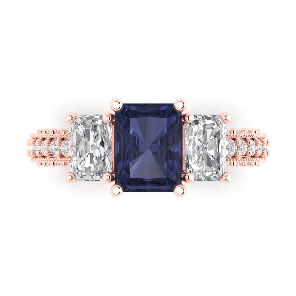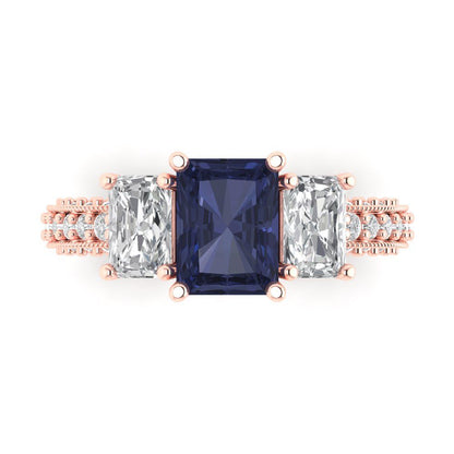 3.61 cttw Simulated Blue Sapphire Three-Stone Engagement Ring - Solid Gold (Emerald Cut,8x6mm)