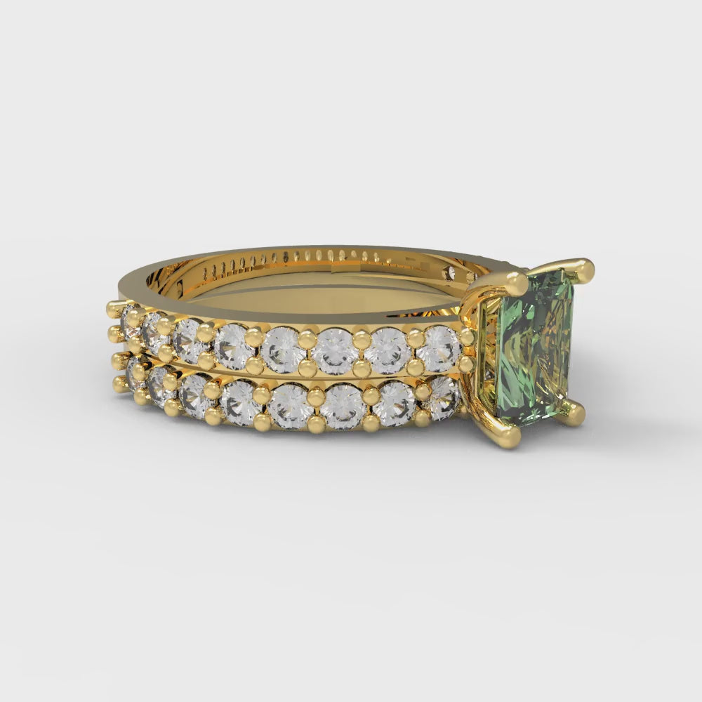 1.325 cttw Emerald Cut Simulated Green Diamond Bridal Set - Solid Yellow Gold Engagement Ring & Wedding Band