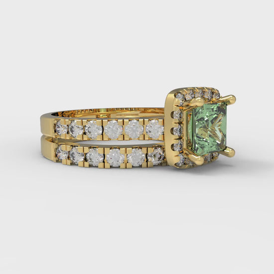 1.56 cttw Princess Cut Simulated Green Diamond Bridal Set - Solid Yellow Gold Engagement Ring & Wedding Band