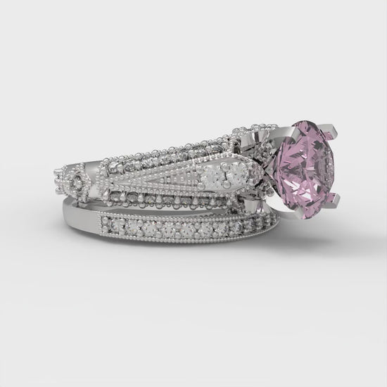 2.095 cttw Round Cut Simulated Pink Diamond Bridal Set - Solid White Gold Engagement Ring & Wedding Band