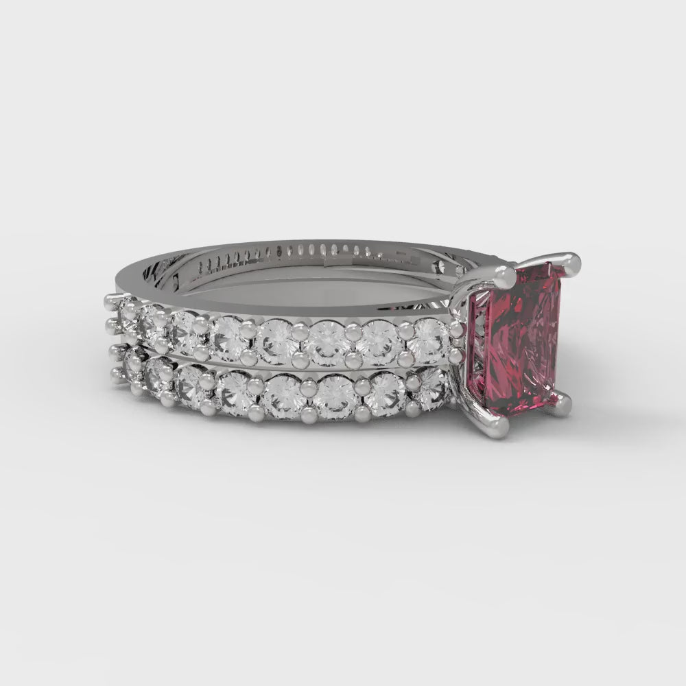 1.325 cttw Emerald Cut Simulated Ruby Bridal Set - Solid White Gold Engagement Ring & Wedding Band
