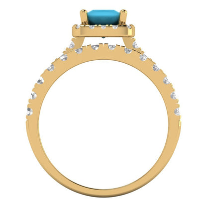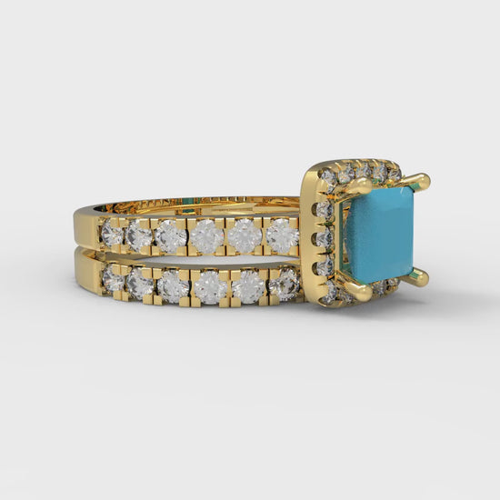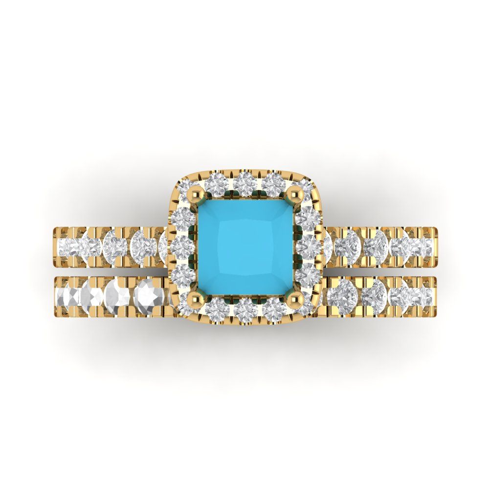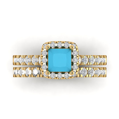 1.56 cttw Princess Cut Simulated Turquoise Bridal Set - Solid Yellow Gold Engagement Ring & Wedding Band
